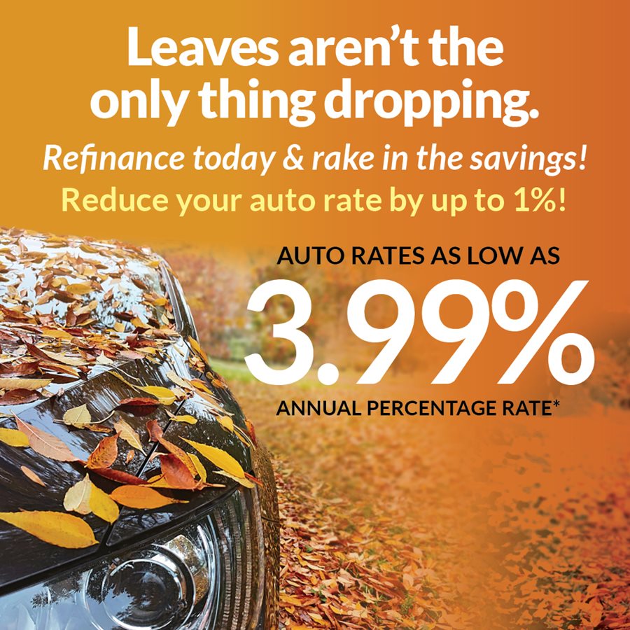 *Auto Loan Refinance on external auto loans only. Proof of the current rate and term is required. Credit Union will reduce the current financed rate up to an additional 1%, as low as 3.99% APR. The current term may be extended twelve (12) months, up to 84 months maximum term. Credit qualification applies. Rate valid November 1 through November 30, 2025.