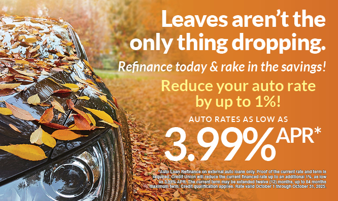 *Auto Loan Refinance on external auto loans only. Proof of the current rate and term is required. Credit Union will reduce the current financed rate up to an additional 1%, as low as 3.99% APR. The current term may be extended twelve (12) months, up to 84 months maximum term. Credit qualification applies. Rate valid October 1 through October 31, 2025.