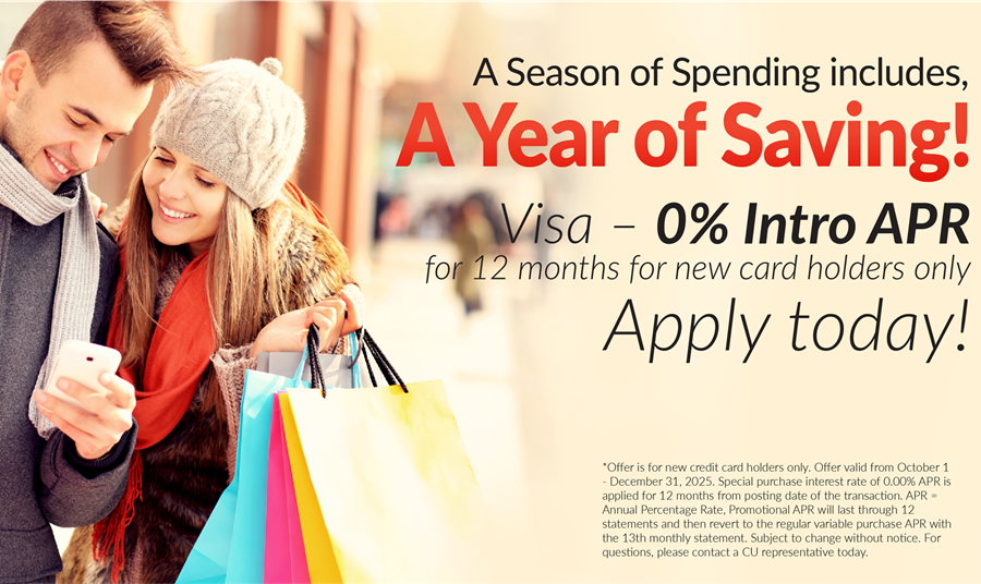 *Offer is for new credit card holders only. Offer valid from October 1 - December 31, 2025. Special purchase interest rate of 0.00% APR is applied for 12 months from posting date of the transaction. APR = Annual Percentage Rate, Promotional APR will last through 12 statements and then revert to the regular variable purchase APR with the 13th monthly statement. Subject to change without notice. For questions, please contact a CU representative today.