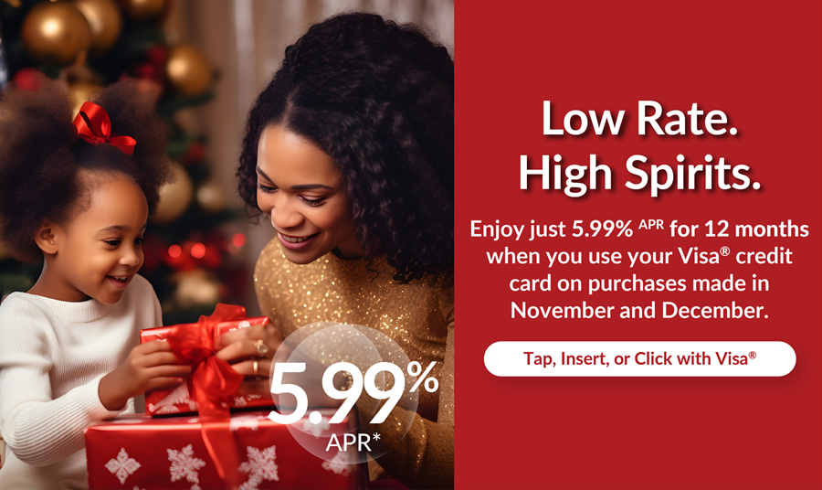 Enjoy just 5.99% APR for 12 months when you use your Visa credit card on purchases made in November and December.