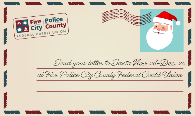 Fire Police City County FCU is helping children send their letters to the North Pole! Drop a letter to Santa Claus in one of the red mailboxes inside the lobby of any of our six branches from November 28 to December 20, and you'll receive a response before Christmas! Be sure to include a name and a return address.